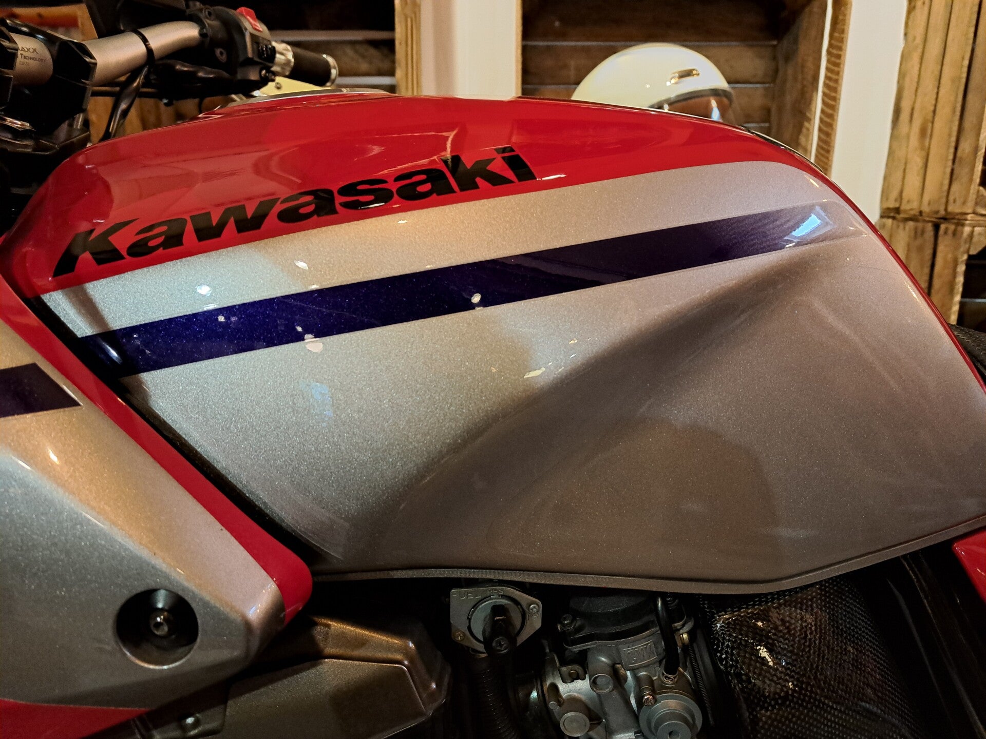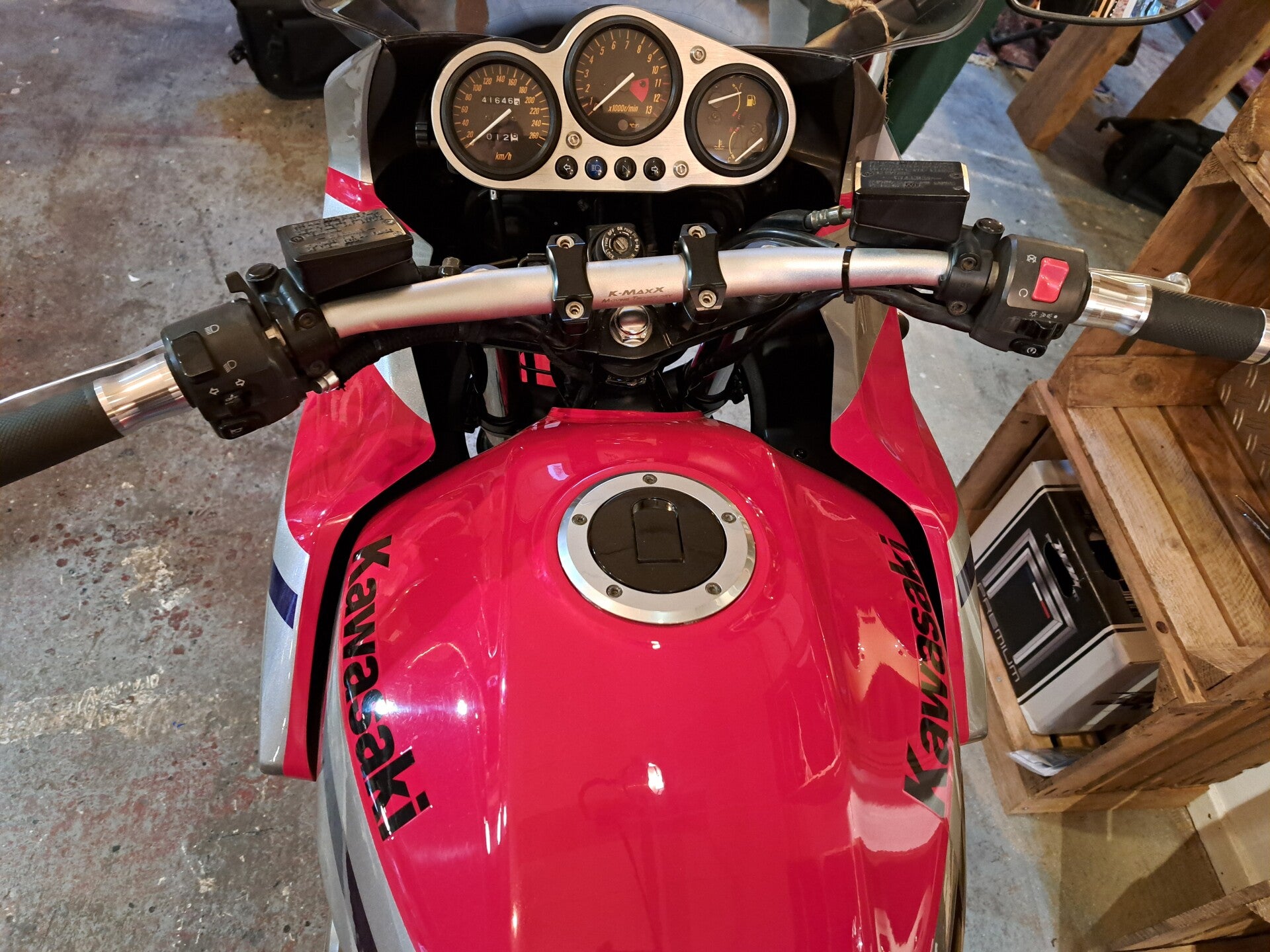 Bijzonder mooie Kawasaki ZRX1200S van 2001 in unieke kleurstelling rood/zilver/zwart welke nog geen 42000km heeft gereden. De motor is bovendien uitgerust met een prostock-stuur, achterschokdemperrisers, carbon afdekkapjes van het luchtfilterhuis en een RVS- radiateurcover. Banden, ketting en tandwielen zijn in hele goede staat. Bovendien zijn recent de kleppen gesteld en is er een beurt uitgevoerd waarbij al het noodzakelijke is uitgevoerd.